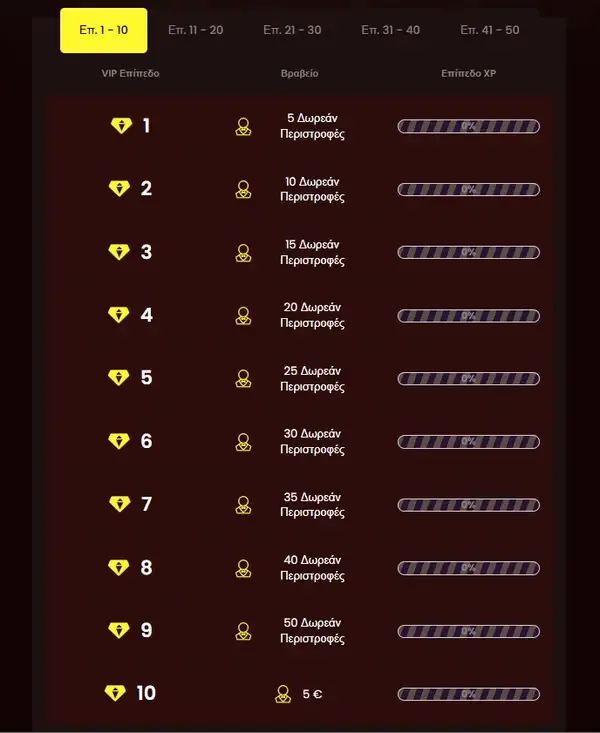 Για τακτικό παιχνίδι, διαθέτουμε ένα πρόγραμμα πιστότητας 50 επιπέδων που βασίζεται σε Comp Points (CP). Κερδίζετε 1 CP για κάθε €5 πονταρίσματος σε Dragonslots κουλοχέρηδες, και το επίπεδό σας ανεβαίνει όσο συγκεντρώνετε περισσότερους πόντους. Το VIP πρόγραμμα μας είναι ενσωματωμένο με αυτά τα επίπεδα πιστότητας, ώστε τα καλύτερα tiers να ξεκλειδώνουν ισχυρότερα οφέλη με την πάροδο του χρόνου.